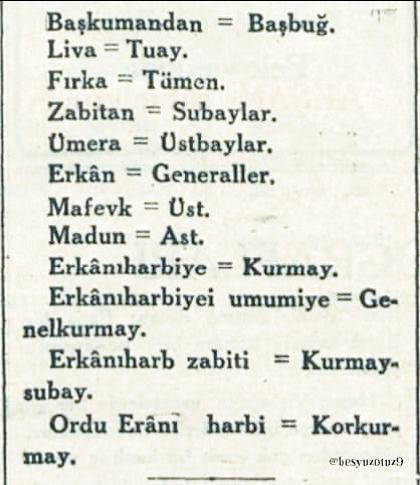 Atatürk’ün bir Geometri terimleri kitabı yazdığı bilinir ancak askeri rütbelere Türkçe karşılıklar bulduğu pek bilinmez. Bu rütbelerin neredeyse hepsi halen kullanılmaktadır. (Akşam, 24 Şubat 1935) (Görsel 2-3)