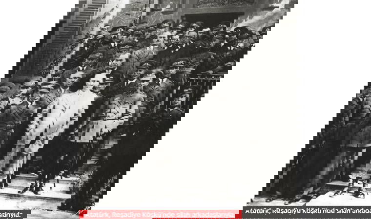 Birinci Dünya Savaşı ve İstiklal Harbi gazisi subaylarla konuşur, Reşadiye Köşkü önünde fotoğraf çektirir. Bu fotoğrafın özelliği,