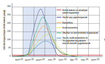 Deneyimler ışığında toplumsal izolasyon için iki çözüm var: Yavaşlatma veya baskılama. Sağlık Bakanlığı iki çözümden yavaşlatmayı tercih etti. Ulaşımın kısıtlanması, sınır kapılarının kapatılması, okulların tatil edilmesi, 65 yaş üzeri sokağa çıkma yasağı gibi kararlar alındı. Adım adım ilerleyen ve gittikçe radikalleşen “evde kal” çağrıları yapıldı. Böylece hastalık kısa sürede en üst seviyede engellenerek zamana yayıldı. Ama dar gelirli çalışan kesim, üretimin aksamaması için çalışmaya devam etti. Eleştirilebilir, bu bir tercihtir. Bu tercihte bizler durumu ortaya koyar ve önerilerimizi yaparız. Gerisi karar vericiye aittir. Ama bu salgında görülen, ne yaparsanız yapın sonuçta tümden bir üç haftalık izolasyona ihtiyaç olduğudur. 16 Mart 2020’de Imperial College’in COVID-19 ile ilgili yaptığı çalışmada, yavaşlatma ve baskılama tercihleriyle ara tercihler sonucunda yüz bin kişiye yatak kapasitesinin nasıl da sorun olduğu yukarıdaki şekilde gösterilmektedir.** Hastalık en üst seviyeye yükseldiğinde hiçbir ülkenin sağlık sistemi bu yükü kaldıramadı. Bu nedenle birinci basamakta en yetkin çalışmayı yapmak gerekiyor. Pandeminin ülkede her kente yayılıp yayılmadığını öğrenemedik. Henüz vaka görülmeyen illeri kurtarabilir miydik? Çin’in bölgesel tedbirleri gibi biz de kentsel tedbirler alabilir, yayılımı bazı bölgelerde kesebilirdik. İllerde pandemi kurulları daha yeni oluşturuldu. Böylece il bazında da inisiyatif kullanılması sağlanmış oldu. Bunun, sorunun çözümüne yönelik olarak ileri bir adım olduğunu düşünüyorum.