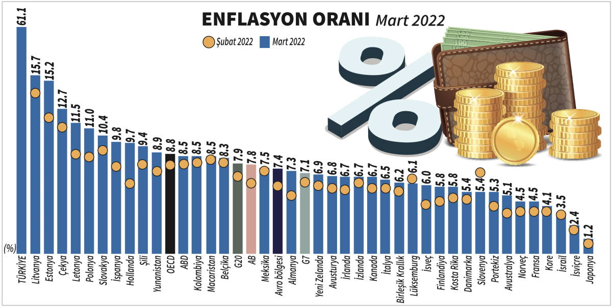 OECD’nin yayımladığı raporda Türkiye'nin mart ayındaki yıllık enflasyonu, en yakın rakibinin dört katı düzeyindedir. O kadar ki, genele ilişkin göstergede şubat ayı verisi ölçeğe sığmadığından farklı şekilde gösterilmiştir. Yıllık enflasyon şubat ayında yüzde 54.4, ocak ayında ise yüzde 48.7 iken nisan ayında yüzde 69.97 olarak gerçekleşmiştir. Kaldı ki TÜİK verilerine mukabil ENAG gibi bağımsız araştırmacıların verileri gerçek verilerin çok daha yüksek olduğunu göstermektedir. TÜİK verilerini esas aldığımızda dahi vahim tablo ortadadır. Dünyada enflasyonist bir eğilim olduğunu kabul etsek dahi Türkiye'nin diğer ülkelerden ayrıştığı ve bazı karşılaştırmalarda kapsam dışı bırakıldığı görülmektedir. Sokakta halk enflasyonu derin bir şekilde hissederken resmi verilerin tabloyu tam olarak yansıtamaması, biraz da sistematiğin bu şekilde kurgulanmasına bağlıdır.