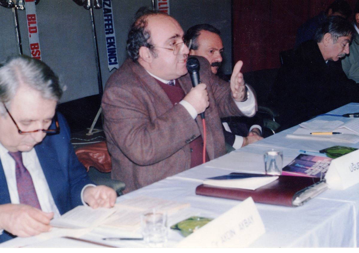 Uğur Mumcu Aydın'da; Prof. Dr. Aydın Aybay, Erol Ertuğrul ve İlhan Selçuk ile İnsan Hakları panelinde konuşurken. (14 Aralık 1990)