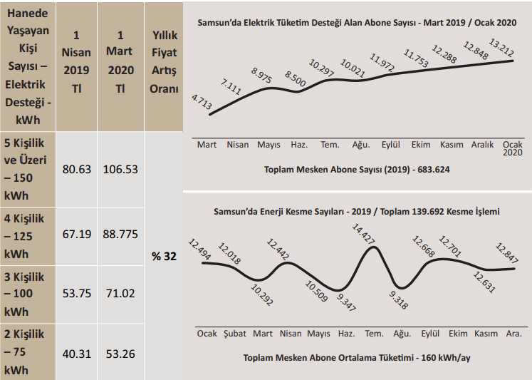 Samsun’da 2018 yıl sonu itibarıyla toplam mesken abone sayısı 683 bin 624 olduğu gözönüne alındığında her yüz haneden ikisi elektrik faturasını ödeyememektedir. Elektrik mesken abonelerinin durumunu gösteren başka bir gösterge de enerji kesme sayılarıdır. Samsun’da 2019 yılı içerisinde toplamda 139 bin 682 adet kesme işlemi yapıldığı görülmektedir. Kesme işleminin beş katı ihbar sayısı olduğu göz önüne alındığında yaklaşık 700 bin adet gecikmeli fatura ödemesi olduğu ortaya çıkmaktadır (Zamanında ödenmeyen fatura sayısı yaklaşık yüzde 5). Kesme bağlama bedellerinin alçak gerilim mesken aboneleri için 37.30 TL ve orta gerilim için 189.80 TL olması da dar geliriler için ayrı bir külfet, çünkü zamanında ödenmeyen faturalar için zaten yasal gecikme fazileri alınıyor. Bu bedelin de mutlaka aldırılması gerekmektedir. Abone grupları dağılımına bakıldığında, zamanında ödenmeyen faturaların yaklaşık yüzde 80’inin mesken abonelerine ait olduğu anlaşılmaktadır. Samsun, mesken aboneleri başına ortalama elektrik tüketimi aylık olarak 160 kWh olup bu da yaklaşık 110 TL etmektedir.