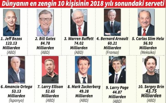 2016’da serveti 45 milyar dolar olan Amazon kurucusu Jeft Bezos, 2018’de servetini neredeyse 3 kat artırarak 123.13 milyar dolara tırmandırdı. Microsoft’un kurucusu Bill Gates ise ikinci sıraya gerilerken servetini 75 milyar dolardan 84.78 milyar dolara çıkardı. Yatırımcı Warren Buffet 3. sıradaki yerini korurken, servetini 61 milyar dolardan 74.02 milyar dolara yükseltti. İlginç olan dünyanın bu en zengin üç sermayedarının ABD’li olması.