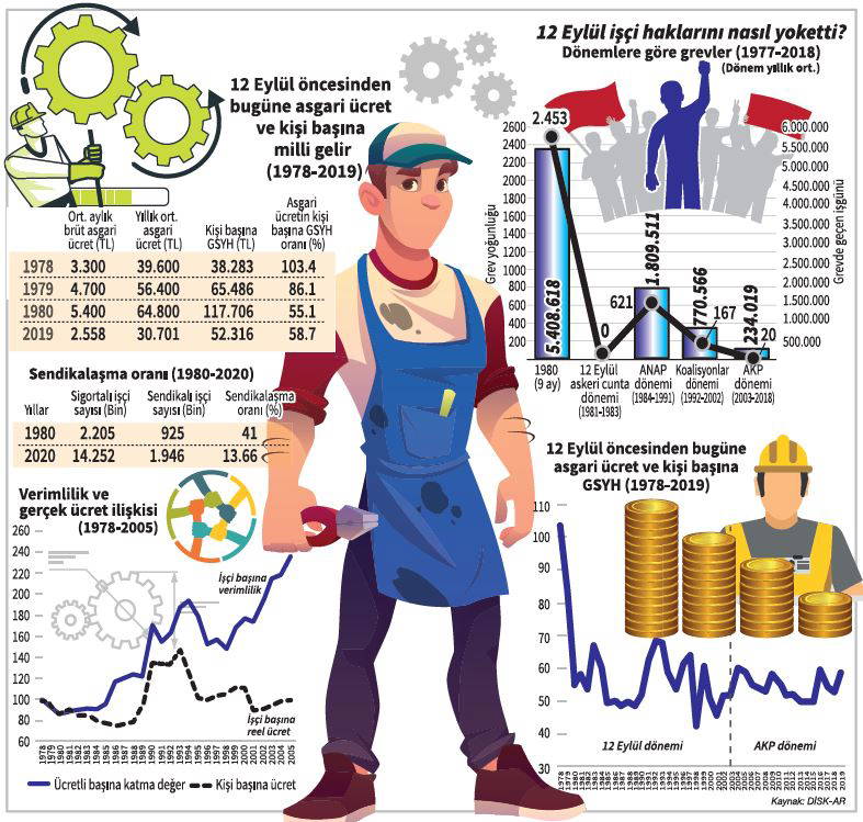 Sınıfsal tercihi sermayeden yana olan ve Türkiye tarihinin etkileri en uzun süren ve en tahrip edici darbesi 12 Eylül çalışma yaşamını sermaye için neredeyse dikensiz bir gül bahçesine çevirdi.