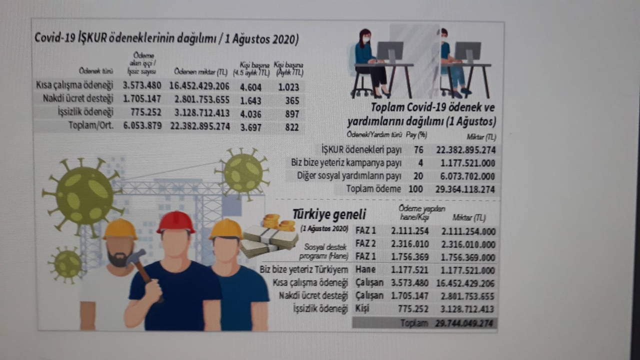 Aile, Çalışma ve Sosyal Hizmetler Bakanlığı, 1 Ağustos 2020 itibarıyla Covid-19’dan etkilenen yoksul ailelere, işçilere ve işsizlere sağlanan destek miktarını ve destek sağlananların sayısını bir infografikle açıkladı.