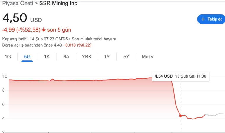 Esas Kanadalı şirketin hisseleri, İliç’te yediği büyük haltın haberi yayılınca yüzde 50’nin üzerinde, 1 milyar dolar değer yitirdi. Amerikan borsasında SSRMining adıyla işlem görüyor. Ana şirketin sitesinde Çöpler de altın üretimi birinci sırada yer alıyor.