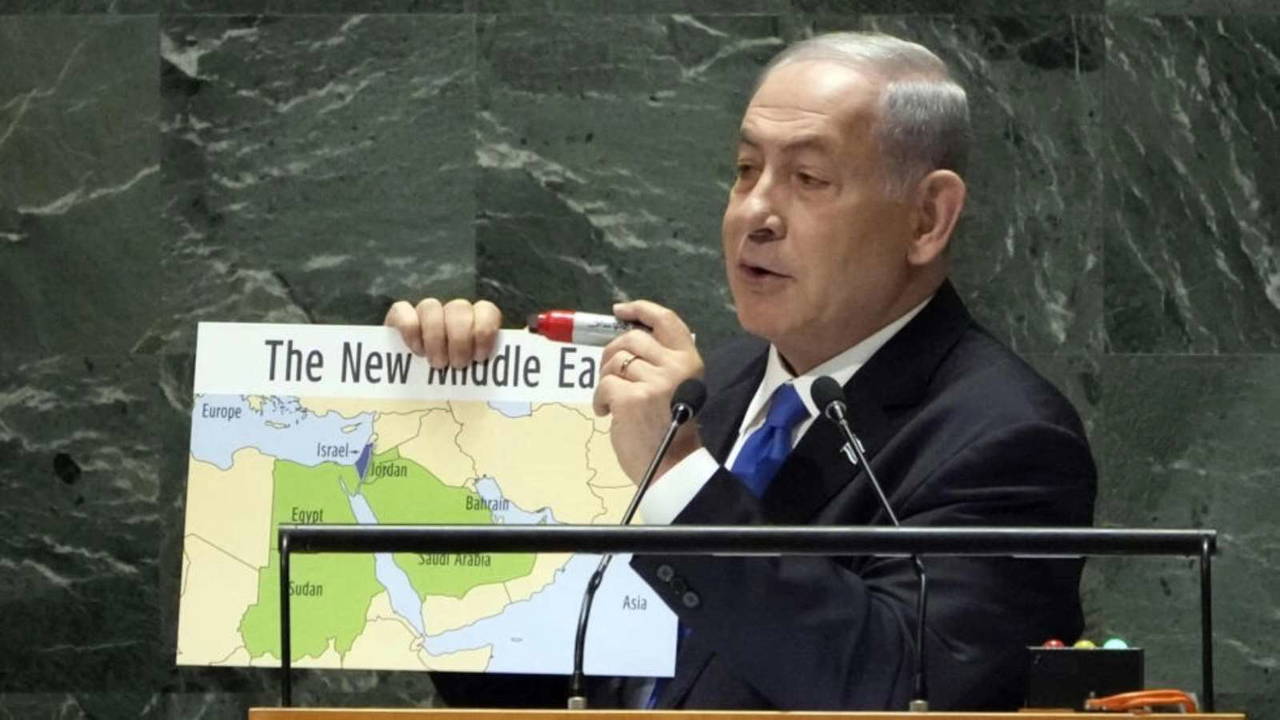 Yandaki haritayı Netanyahu 22 Eylül’de Birleşmiş Milletler’de yaptığı konuşmada gösteriyor. Henüz 7 Ekim’e zaman var. Harita, ABD’nin İsrail ile pek çok Arap ülkesini buluşturmasıyla ortaya çıkan İbrahim Anlaşması’nın sonuçlarını gösteriyor. Yeni Ortadoğu yazıyor haritanın başında. Önce baktım yeni İsrail ülkesini mi gösteriyor; Ürdün, Sina Yarımadası vb. dahil, işgal edileceklerle birlikte büyük İsrail.