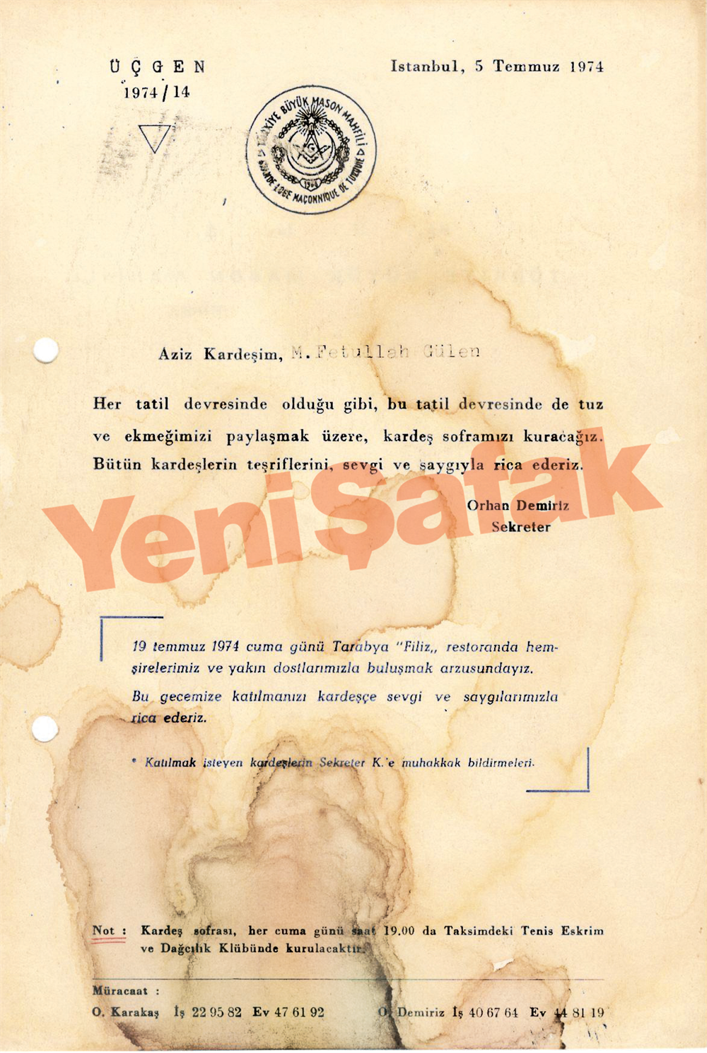“Paralel yapının 1 numarası Fethullah Gülen’in şimdiye kadar hiç bilinmeyen ilişkileri açığa çıktı. Yeni Şafak’ın ulaştığı tarihi belgelere göre, Gülen ilk gençlik yıllarında Masonluk yemini etti ve üstün hizmetlerinden dolayı taltif madalyası aldı.”