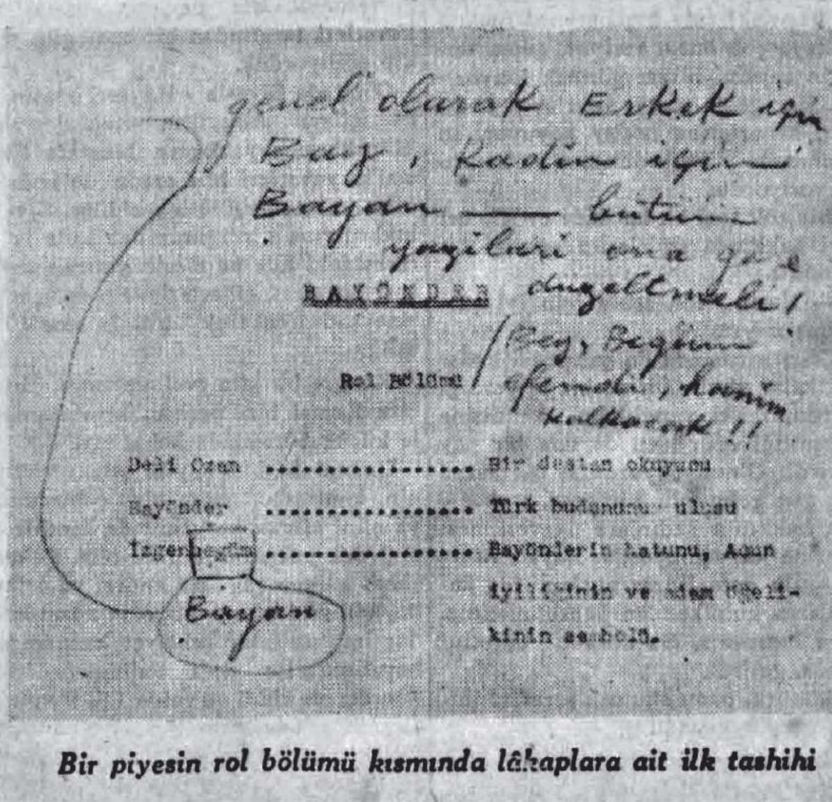 Bayönder Operası’nda Atatürk’ün düzelttiği rol bölümündeki isimler. (Ulus, 10 Kasım 1939, s. 14.)
