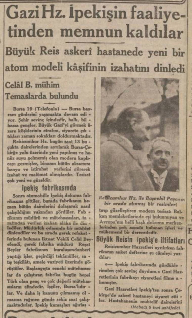 92 yıl önce, 19 Ocak 1933 tarihinde, Cumhurbaşkanı Gazi Mustafa Kemal Atatürk Bursa’ya giderek İpekiş Dokuma Fabrikası’nı ziyaret etti. 20 Ocak 1933 tarihli Cumhuriyet gazetesinin haberine göre; Atatürk “…Otomobille İpekiş Dokuma Fabrikası’na gittiler. Burada fabrikanın hemen bütün dairelerini dolaşarak nasıl çalışıldığını yakından gördüler. Fabrikanın müdürü ve mütehassısları tarafından verilen izahatı alaka ile dinlediler. Müdürlük odasında bir müddet dinlendiler ve bu sırada gerek refakatlerinde bulunan İktisat Vekili Celal Beyefendi, gerek fabrika müdürü Reşat Beyler fabrikanın kuruluşundan beri yaptığı işler, geçirdiği tekâmüller, satış teşkilatı, amele (işçi) vaziyeti üzerinde görüştüler. Başlangıçta ecnebi (yabancı) mütehassıslar da çalıştıran fabrika, bugün hepsi Türk olan genç ve çok değerli mütehassısların elindedir. İşçiler, Bursalıdırlar. Ve daha İş Kanunu çıkmamış olmasına rağmen günde 8 saat çalışmaktadırlar. İpekiş kumaşları ağırlaştırıp güzelleştiren modern tesisatı, Balkan memleketlerinde eşi bulunmayan ve Avrupa’nın belli başlı dokuma merkezlerinden pek azında bulunan işleri ve mükemmel bir derecededir. Reisicumhur Hazretleri ayrılırken fabrikanın anket defterine şu cümleyi yazdılar: ‘İpekiş fabrikasında gördüklerimden çok sevinç duydum.’ Gazi Hazretlerinin fabrikayı ziyaretleri filme de alınmıştır.”