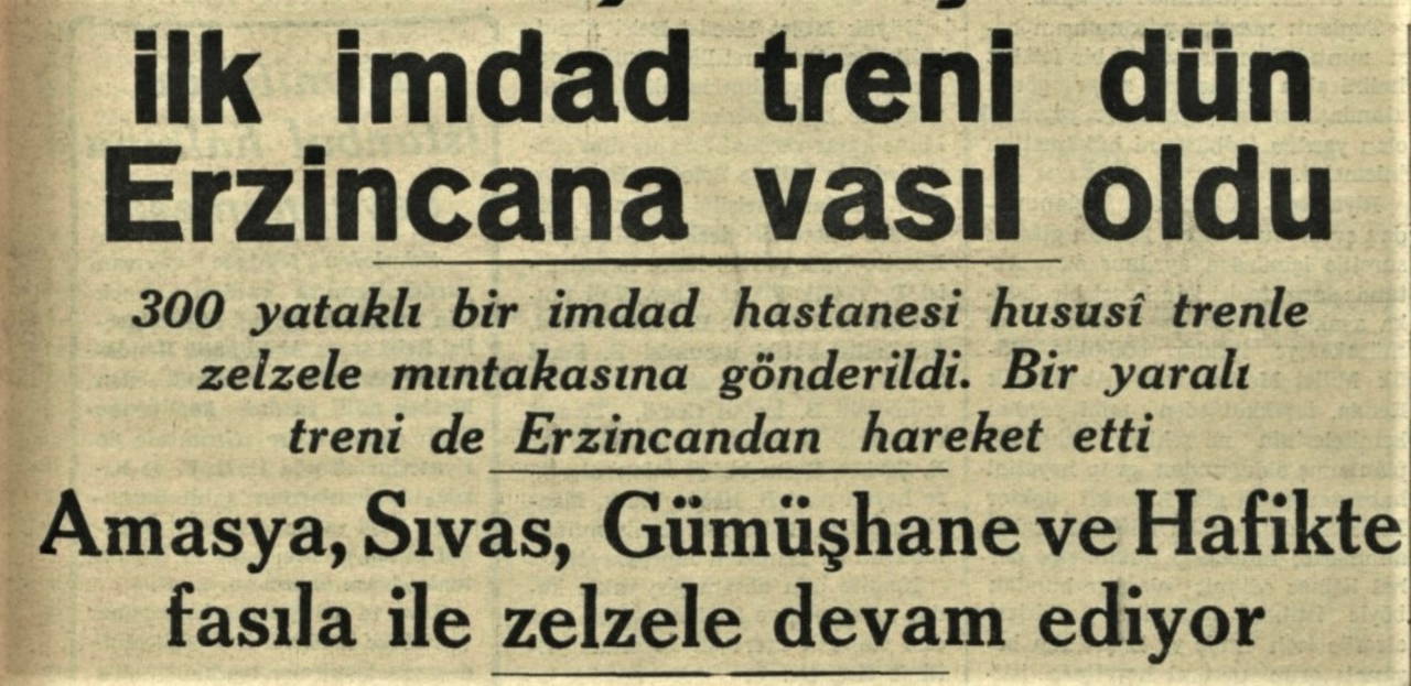 Kızılay, 29 Aralık 1939’da deprem bölgesine ilk imdat hastane trenini gönderdi. 300 yataklı bir numaralı Kızılay Çadırlı İmdat Hastanesi 31 Aralık 1939’da Erzincan’a vardı. Hastane röntgen cihazı, çeşitli laboratuvarlar ve salgın hastalıklarla mücadele etmek için gerekli her türlü araç gerece sahipti. Hastanede yeterli sayıda uzman doktorla birlikte Bursa milletvekili Operatör Dr. Sadi Konuk, Edirne milletvekili Dr. Fatma Memik, Erzincan milletvekili Eczacı Salih Başotaç da bulunuyordu (Akşam, 30 Aralık 1939; Ulus, 30 Aralık 1939; Ulus, 4 Ocak 1940)