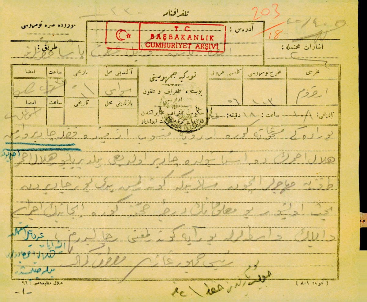 Kızılay'a ait çadırların Erzurum'a gönderilmesi hakkında Atatürk'ün Başbakan İsmet İnönü'ye yazdığı bir telgraf. (BCA, 30-10-0-0,178-232-18,1.10.1924)