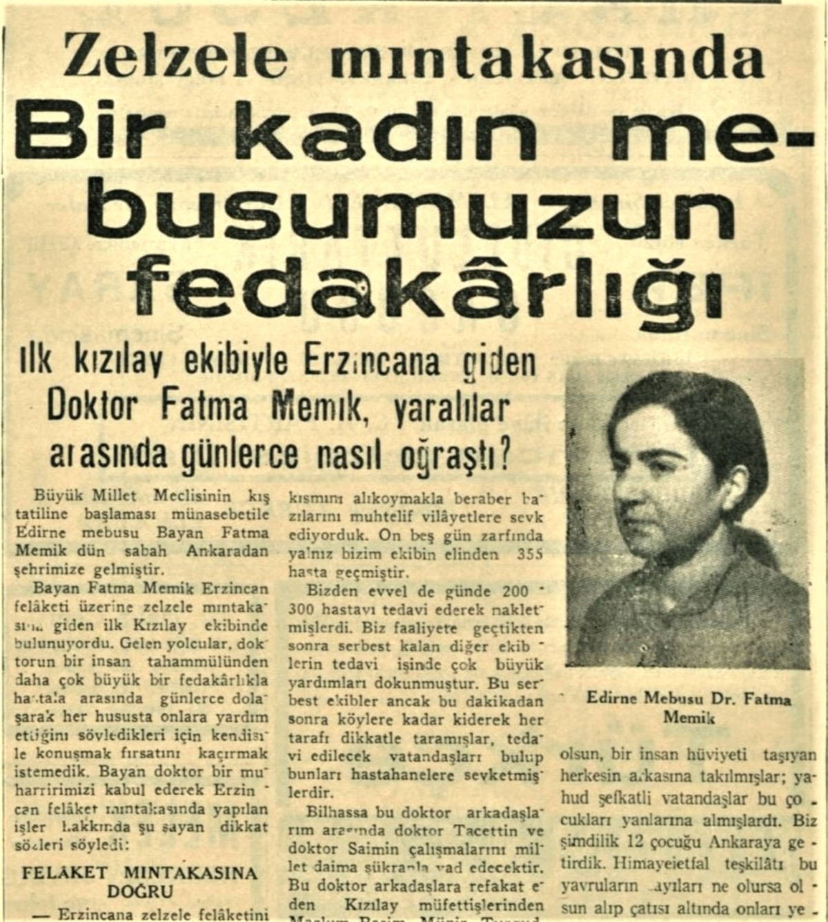Kızılay’ın Çadırlı İmdat Hastanesi doktorlarından Fatma Memik, izlenimlerini Vakit gazetesine anlattı: “Erzincan’a, bir müddet gecikme ile salı günü saat onda vardık. Bizden evvel bir ana baba günü olan bu felaket mıntıkasına Ankara Numune Hastanesi’nden, Kayseri’den, Erzurum’dan müteaddit ekipler gelmiş; hatta epey iş görmüşlerdi...”