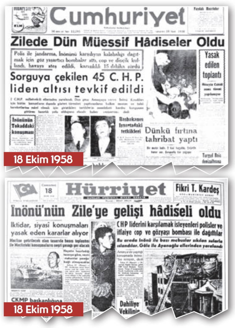 17 Ekim 1958’de Zile’de İnönü’yü karşılamaya gelen halkı, polisler copla; jandarmalar dipçikle dağıttı. Emniyet Müdürü, İtfaiye arazözlerini kullanarak halka su sıktı. Mitinge katılan halkı dağıtmak için göz yaşartıcı bomba bile atıldı. (Toker, s. 126-128)