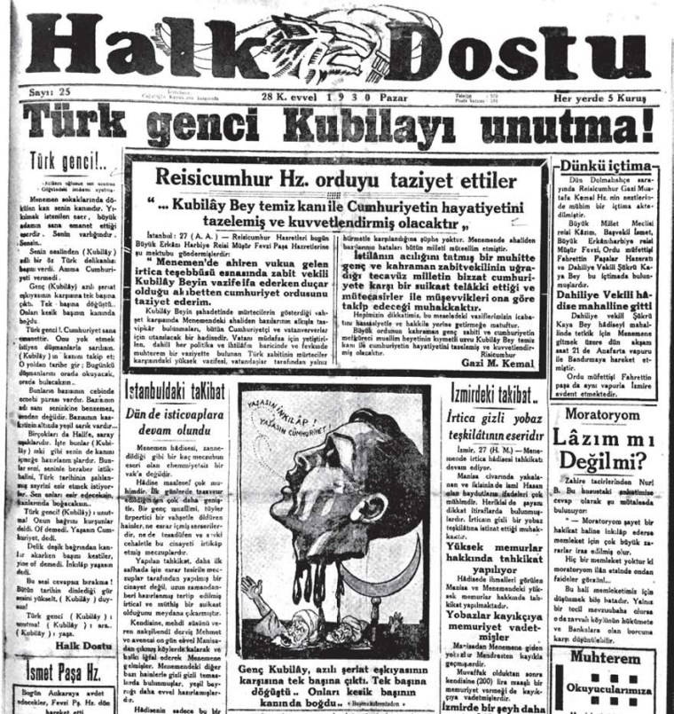 1 Ocak 1931’de TBMM’de yapılan oturumda Menemen Olayı “Cumhuriyet karşıtı bir irtica olayı” olarak adlandırılıyor. Menemen Türk Ocağı, “Bu irtica baskınını unutma!” diye başlayan bir bildiri yayımlıyor. Bütün okullara Kubilay’ın resmi asılıyor. Kubilay’ın Menemen’de öğretmenlik yaptığı “Zafer” okuluna “Kubilay” adı veriliyor. Kubilay’ın eşine ve çocuklarına “vatana hizmet maaşı” bağlanıyor. Atatürk’e, olayı kınayan telgraflar çekiliyor. Pek çok ilde irtica karşıtı mitingler yapılıyor. 31 Aralık 1930’da İstanbul Darülfünunu’nda “İrticayı Telin Mitingi” yapılıyor. Orada Hukuk Mektebi Müderrisi Muhiddin Adil Bey şunları söylüyor: “Arkadaşlar aslında imha edilmek istenen Kubilay değildir, bu Kubilay timsalidir. Caniler, şuurla hareket etmişler, yeniyi, hürriyeti, medeniyeti, gençliği ve Cumhuriyeti imha etmek istemişlerdir…” Gazeteler, Menemen olayını “Cumhuriyet karşıtı bir irtica olayı” olarak okurlarına aktarıyor.