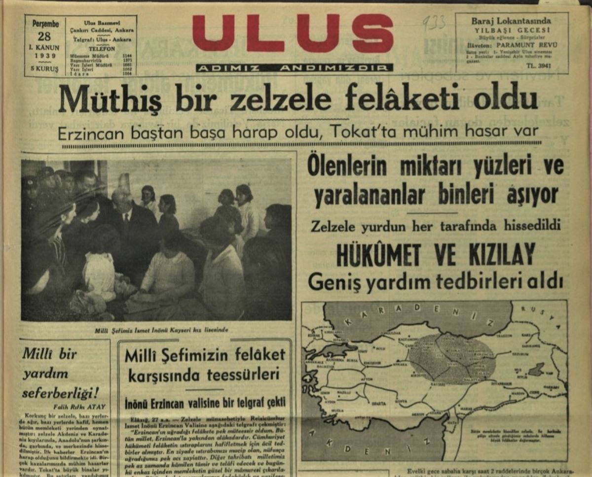 “Erzincan halkının mühim bir kısmı öldü… Dahiliye ve Sıhhiye vekilleri bu sabah Erzincan’a hareket ettiler. Kızılay zelzele mıntıkasına para, çamaşır, çadır ve battaniye gönderdi. İmdat trenleri gitti. Meclis, bir milli yardım komitesi kurdu.” (Akşam, 28 Aralık 1939)