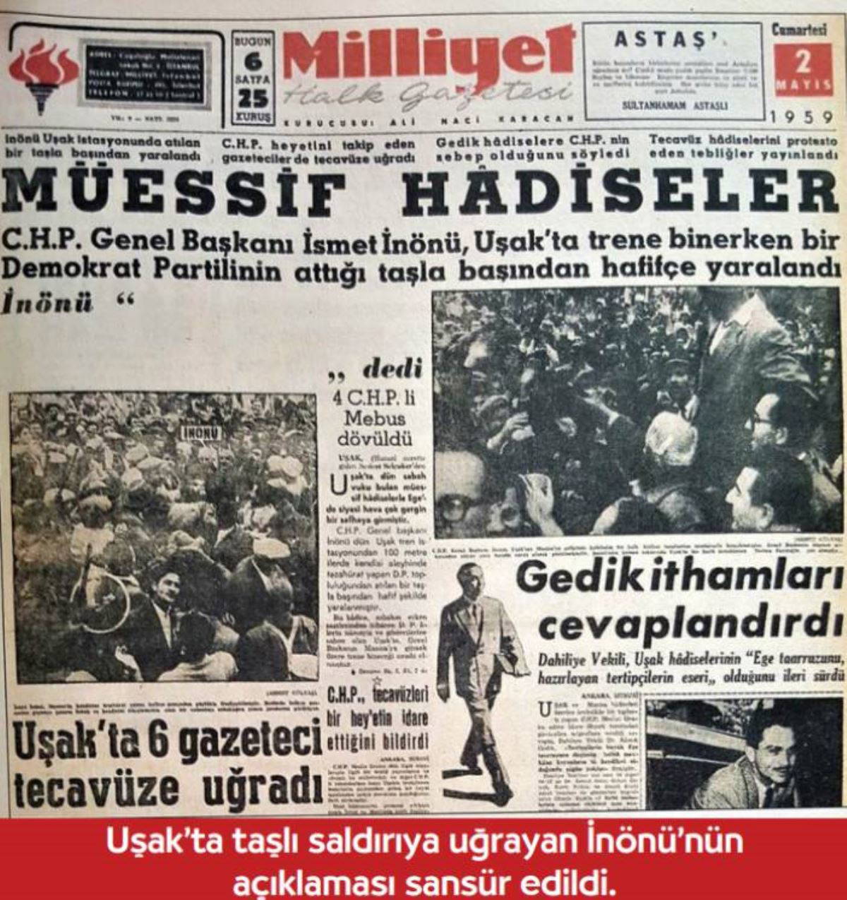 7 Mayıs 2023 Pazar günü Erzurum mitinginde Ekrem İmamoğlu’na taşla saldırıldı. Saldırıda, yaralanan insanlar oldu. 2023’te Ekrem İmamoğlu’na Erzurum’da yapılan taşlı saldırı, 64 yıl önce, 1959’da İsmet İnönü’ye Uşak’ta yapılan taşlı saldırıyı anımsattı. Bir kere daha tarihin çirkin tekrarına tanık olduk.