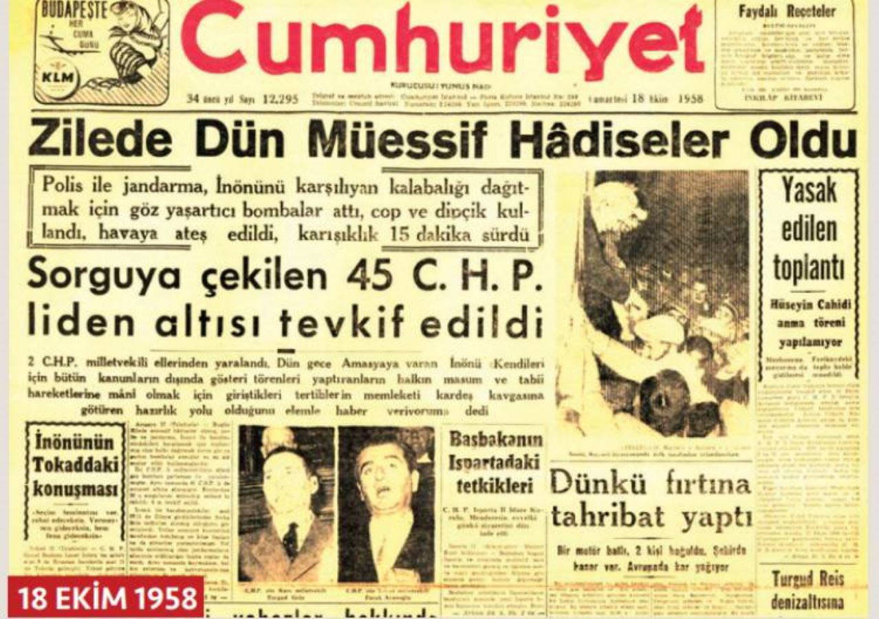 Zile’de İnönü’yü karşılamaya gelen halkı, polisler copla; jandarmalar dipçikle dağıttı. Emniyet müdürü, İtfaiye arazözlerini kullanarak halka su sıktı. Mitinge katılan halkı dağıtmak için göz yaşartıcı bomba bile atıldı. (Toker, s. 126-128)