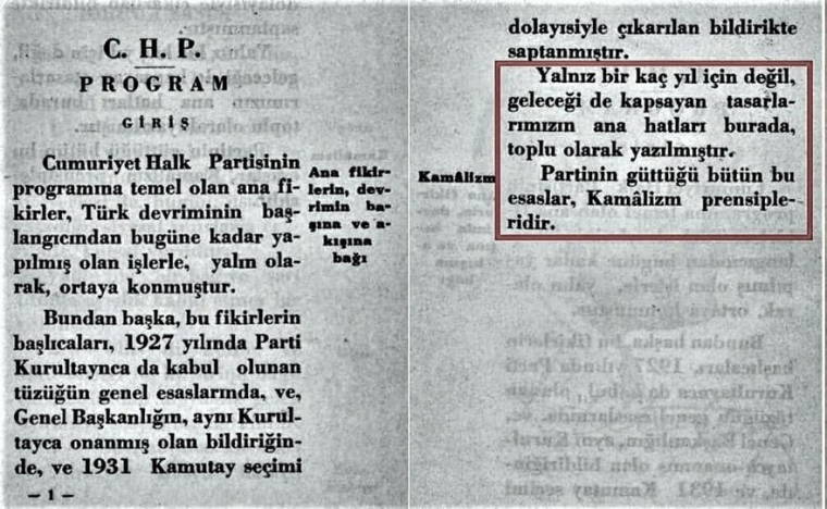 13 Mayıs 1935’te kabul edilen CHP Parti Programı’nın giriş bölümü’nde, “Kemalizm Prensipleri”nden söz ediliyor.
