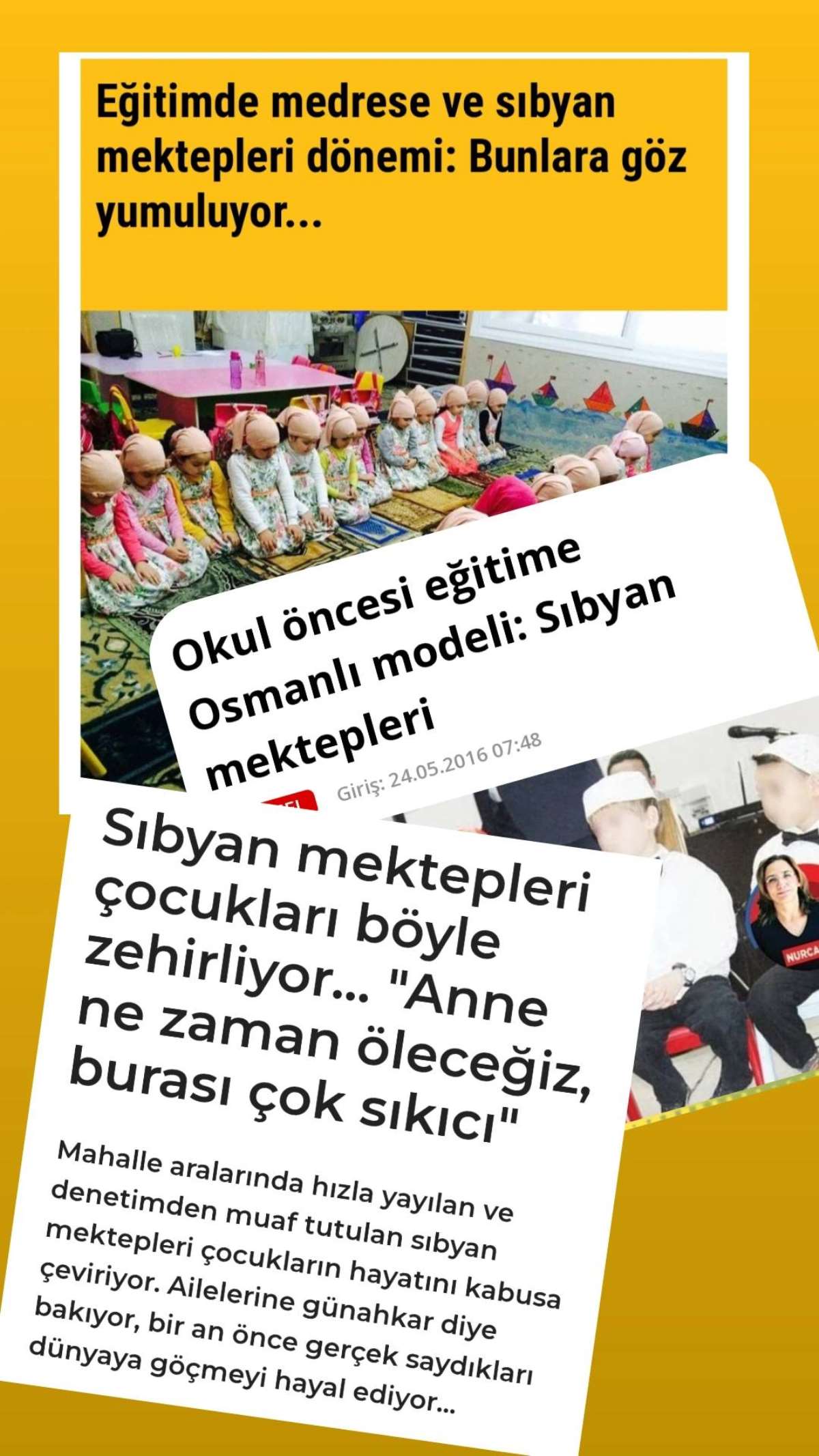 Osmanlı döneminin dinsel ağırlıklı eğitim-öğretim veren sıbyan mektepleri AKP iktidarının eğitimi dinselleştirme politikası kapsamında yeniden açılmaya başlandı. Yukarıda, son birkaç yılda basında yer alan sıbyan mektebi haberlerinden bazıları.