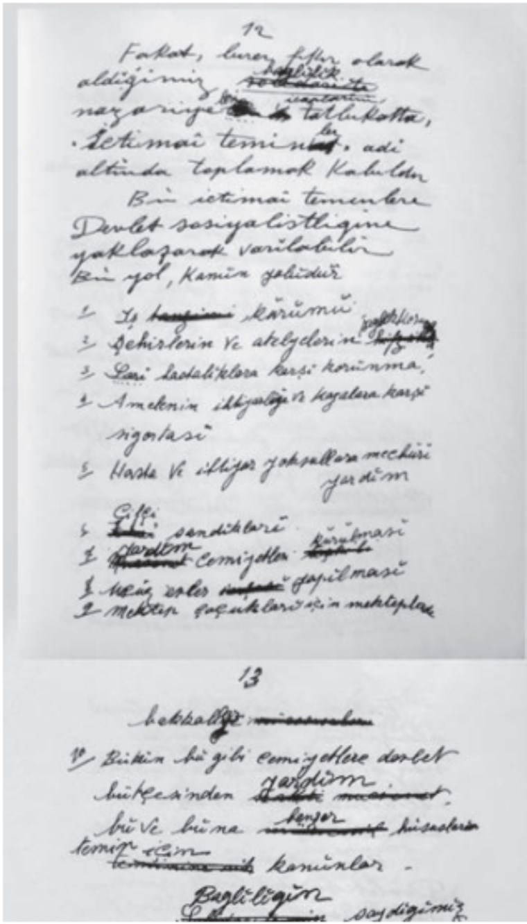 Atatürk’ün, işçiler için 10 maddede topladığı “toplumsal güvenceler” ve “Bu toplumsal güvencelere, devlet sosyalistliğine yaklaşarak varılabilir” cümlesi. (Vatandaş İçin Medeni Bilgiler kitabı el yazıları)