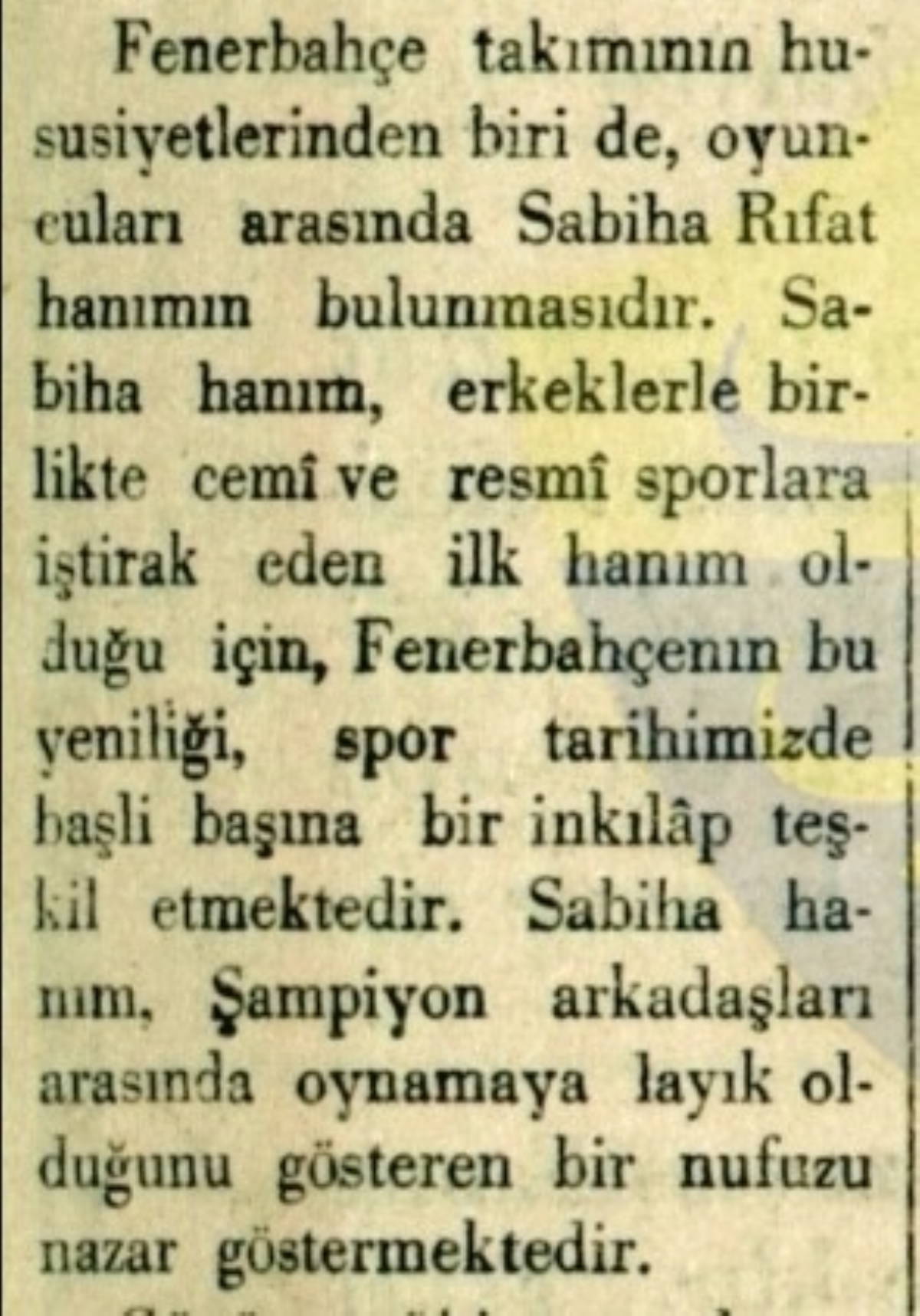 “Bu memlekette ilk defa cem’i bir sporda erkek arkadaşlarla beraber oynamak suretiyle gösterdiğiniz teceddüd ve muvaffakiyetten dolayı sizi Fenerbahçe gençliği ve heyet-i idaresi adına hararetle tebrik ederim efendim.”