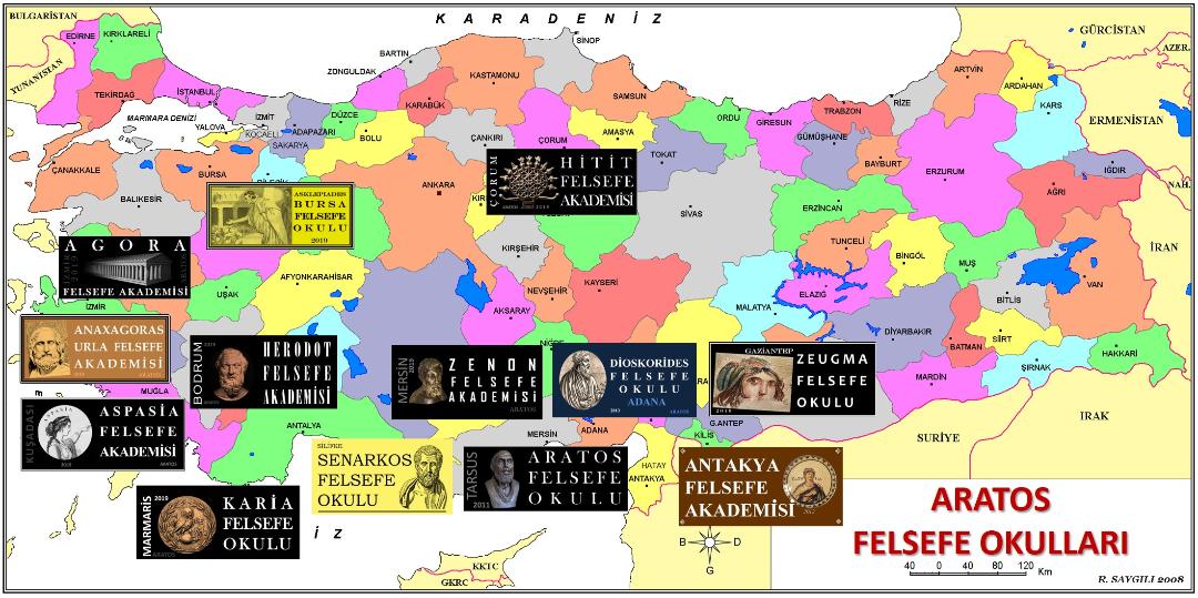 Tarsus’ta ateşi yakan kişinin adı Uğur Pişmanlık. Onu eskiden beri tanısam da, bu sayfaya taşımama neden olan şey bu gördüğünüz Türkiye haritası... 15 kentte açılmış Aratos Felsefe Okulları’nı gösteren harita... Her kentteki okulun, o kentle ilişkili özgün adı var. Aratos’un kurucusu olduğu bu okullarda 30 üniversiteden 60 akademisyen gönüllü olarak ders veriyor.