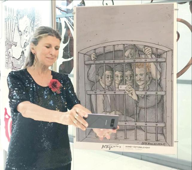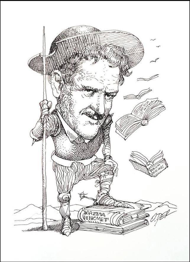 Panolar boyunca dünyanın her yerinden gelmiş karikatürlerden Nâzım Hikmet bize bakıyordu. Her pano, şairi farklı çizgilerle, farklı yöntemlerle, farklı renklerle, farklı tatlarla ifade ediyordu ama hepsinin ortak bir yanı vardı... Hepsi usta işiydi ve hepsi memleket hasretini dile getiriyordu. Kiminde şairin “Yarısı buradaysa kalbinin / yarısı Çin’deydi”...