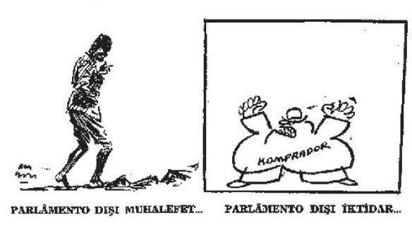 Özellikle biri günümüze öylesine uyuyor ki dakikalarca karikatüre bakıp düşündükten sonra bu yazıyı yazdım. Ali Ulvi, 25 Ekim 1969 tarihli Cumhuriyet gazetesinin kapak sayfasında yayımlanan karikatüründe, Atatürk’ü Büyük Taarruz sırasında fotoğrafçı Etem Tem’in çektiği efsaneleşen Kocatepe fotoğrafındaki görüntüsüyle çizip altına “Parlamento dışı muhalefet” yazmış. Solda ise başında fötr şapkası ile kocaman bir komprador var; o da “Parlamento dışı iktidar”!