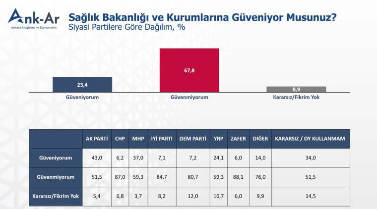 2. Yenidoğan çetesi olayları sonrasında Sağlık Bakanlığı ve kurumlarına güveniyor musunuz? Bu soruya verilen yanıtlarda toplumun yüzde 23.4’ü güvendiğini belirtirken yüzde 67.8’i güvenmediğini belirtmiş. Siyasi partilere göre oy oranlarına bakıldığında ise aşağıdaki tablo görülüyor. AKP seçmenlerinin yüzde 51.5’i, Cumhur İttifakı’nın ortağı MHP’nin seçmenlerinin ise yüzde 59.3’ü “Hayır” yanıtını vermiş!