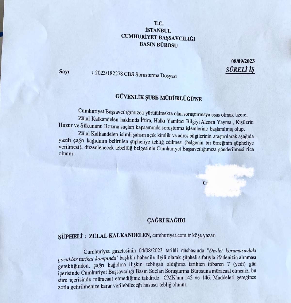 13 Eylül’de gazetemize gelen bir görevli, İstanbul Cumhuriyet Savcılığı’na ait bir çağrı kâğıdını bırakıp gitmiş. Şüpheli olarak aranan benmişim. Nedir diye bakınca fotoğraftaki metni okudum.