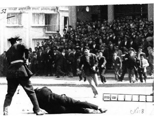 Orta bahçe tıklım tıklım dolu, heykelin önünde İstiklal Marşı söyleyen gençlerin üzerine, polisler coplarla saldırıyorlar. Eli tabancalı polisler büyük hukuk âlimi İstanbul Üniversitesi Rektörü Prof. Dr. Sıddık Sami Onar’ı tartaklıyorlar ve yerlerde sürüklüyorlar.