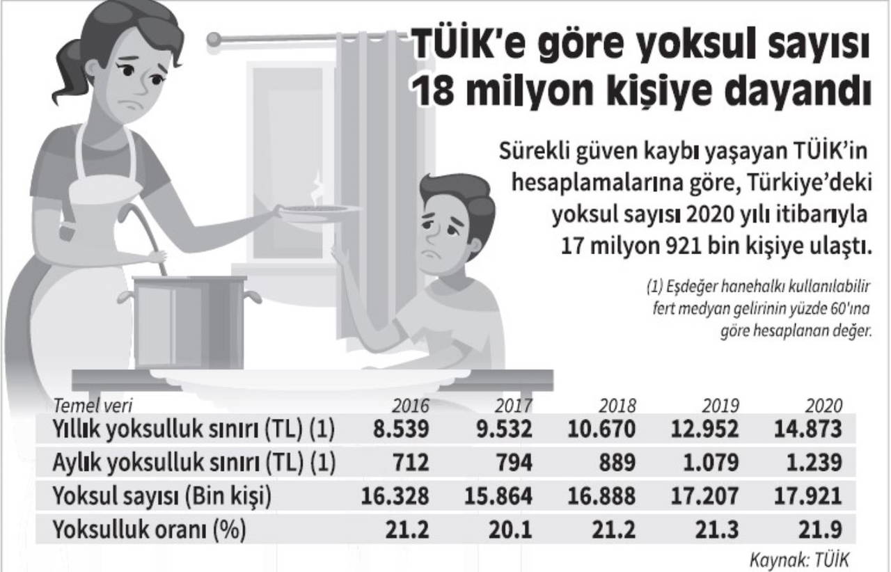 Türkiye’de yaşanan bu ve benzer gelişmeler, özellikle son beş yılda yoksulluğu çok çarpıcı boyutlara taşıdı. Küresel Covid-19 salgını ise bu durumu daha da görünür hale getirdi. TÜİK’in resmi verilerine göre bile, Türkiye’deki yoksul sayısı 2016 yılından 2020 yılına 16 milyon 328 bin kişiden 17 milyon 921 bin kişiye yükseldi. Yoksulluk oranı da yüzde 21.2’den yüzde 21.9’a ulaştı.