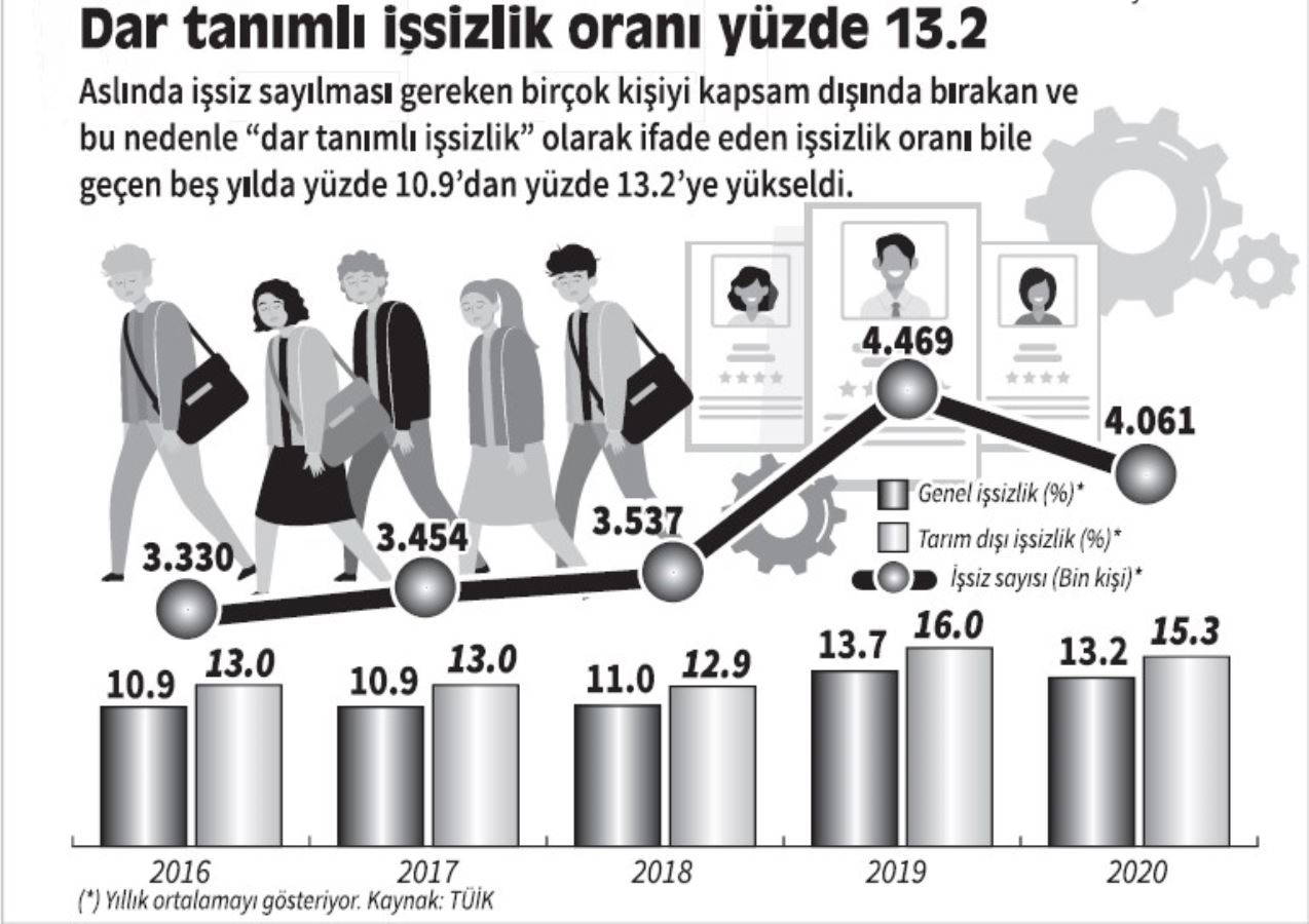 Yoksullaşmanın en büyük nedeni işsizlik... Türkiye İstatistik Kurumu’nun (TÜİK) verilerine göre Türkiye’de “dar tanımlı işsizlik” oranı Temmuz 2021 itibarıyla yüzde 12. İşsiz sayısı ise 3 milyon 932 bin kişi. Bu rakamlar beş yıl önce, Temmuz 2017’de sırasıyla yüzde 10.6 ve 3 milyon 367 kişiydi. Bu oran, 2020’de yüzde 13.2’ye ulaştı. İşsiz sayısı ise 3 milyon 330 binden 4 milyon 61 bine çıktı.
