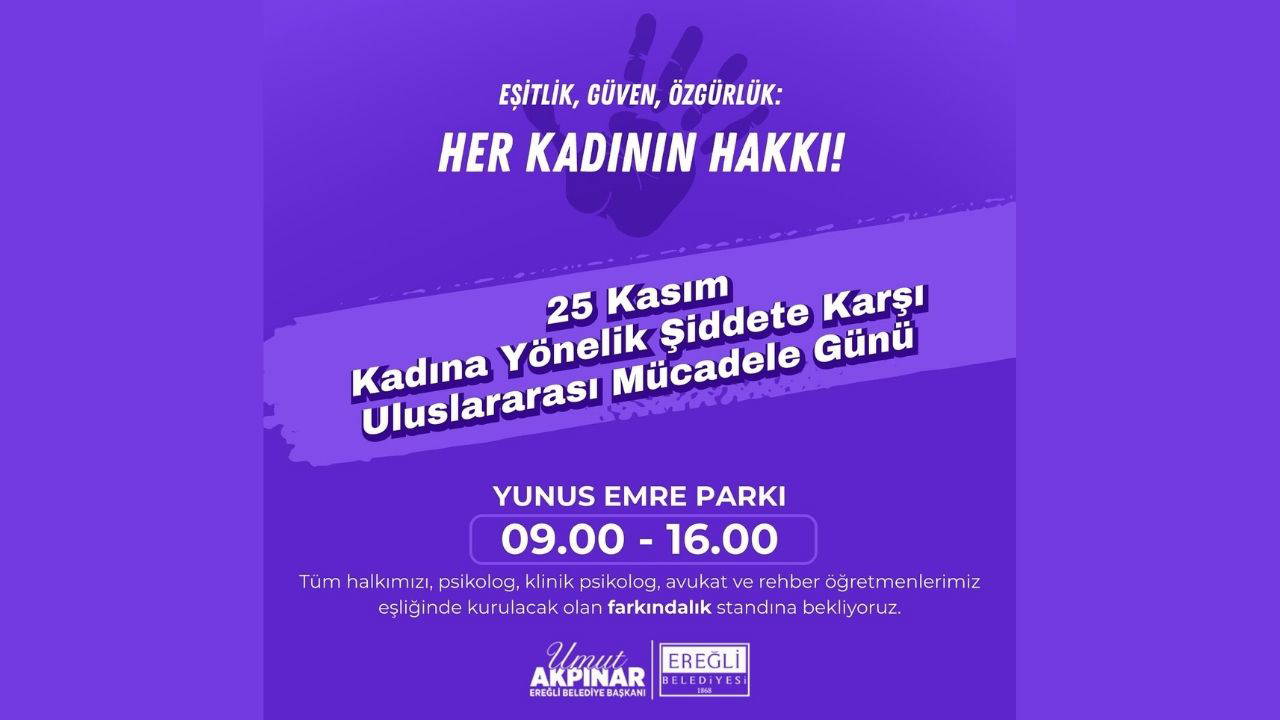 Konya Ereğli Belediyesi, 25 Kasım Kadına Yönelik Şiddete Karşı Uluslararası Mücadele Günü kapsamında avukat, psikolog, klinik psikolog ve rehber öğretmenlerinin yer alacağı farkındalık standı kuracak.