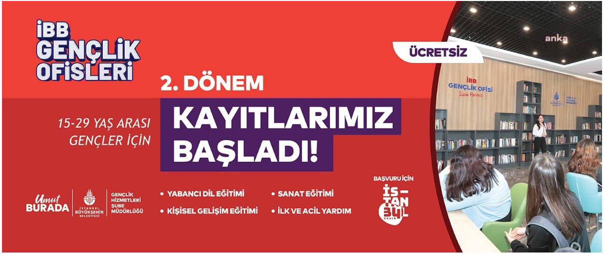 İBB Gençlik Ofisleri eğitim programlarının başvuruları ise İstanbul Senin mobil uygulamasından alınıyor. Kontenjanların sınırlı olduğu eğitimler 26 Mayıs’ta başlayacak. İBB Gençlik Ofisleri, gençlerin eğitim, kişisel gelişim ve istihdamlarına yönelik kurs ve seminer programları ile gelişimlerine katkı sağlayabilecekleri, sınavlara hazırlanabilecekleri, dinlenip kaliteli zaman geçirebildikleri alanlar olarak hizmet veriyor. İstanbul’da sekiz lokasyonda hizmet veren ofislerde genel olarak derslik, kitap kafe, kütüphane, eğitim salonu, dinlenme alanı, ritim atölyesi, idari ofisler, ders çalışma alanları, bilgisayar eğitim salonu, seminer ve sahne sanatları alanı, sesli çalışma odası, analog ve dijital oyun alanları gibi alanlar yer alıyor.